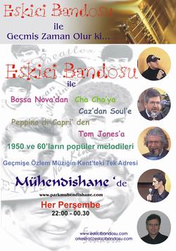 Önce diskoteğimizden aşina melodiler , 21.30 dan itibaren de tanıdık simalar ; Eskici Bandosu... 24.00 e kadar canlı müzik , tekrar duymaktan zevk alacağınız melodiler hatta dans ama terleme korkusu olmadan. Ağaçların oksijenine , geçmişe özlem’ in insanı gençleştiren enerjisi karışacak.